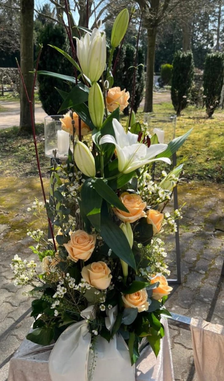 Gesteck mit weißen Lilien und cremefarbenen Ecuador-Rosen (siehe Bild rechts).