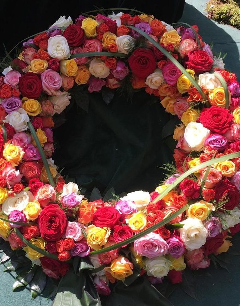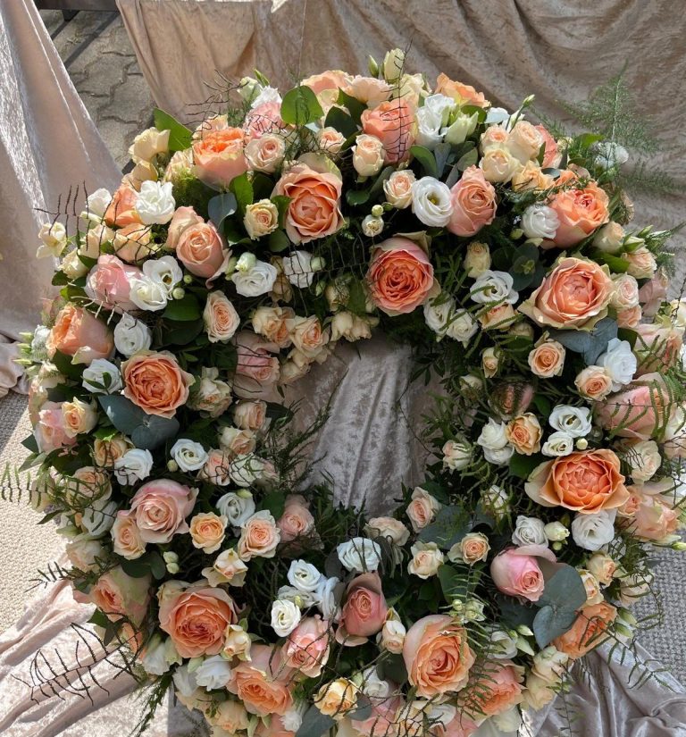 Diese Rosenkranz besteht fast nur aus Rosen in gelb, weiß, orange und rosa. Die feinen Gräser veredeln dieses Meisterstück.