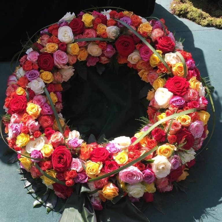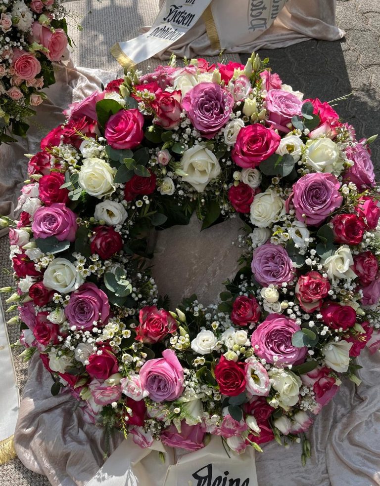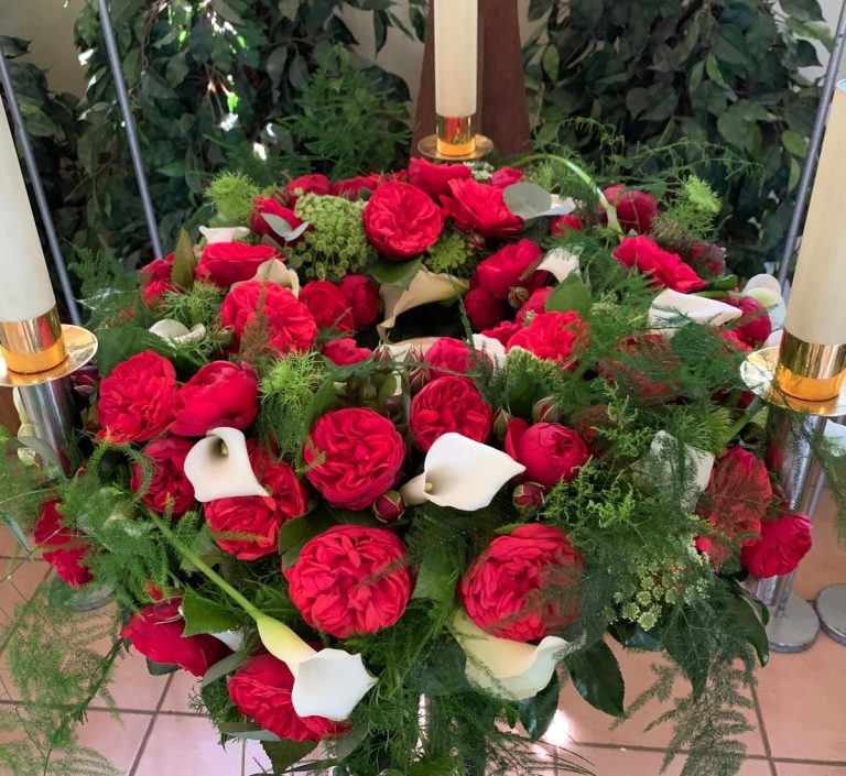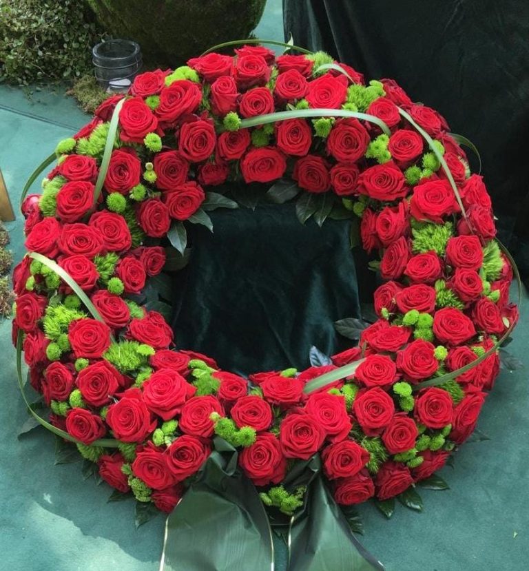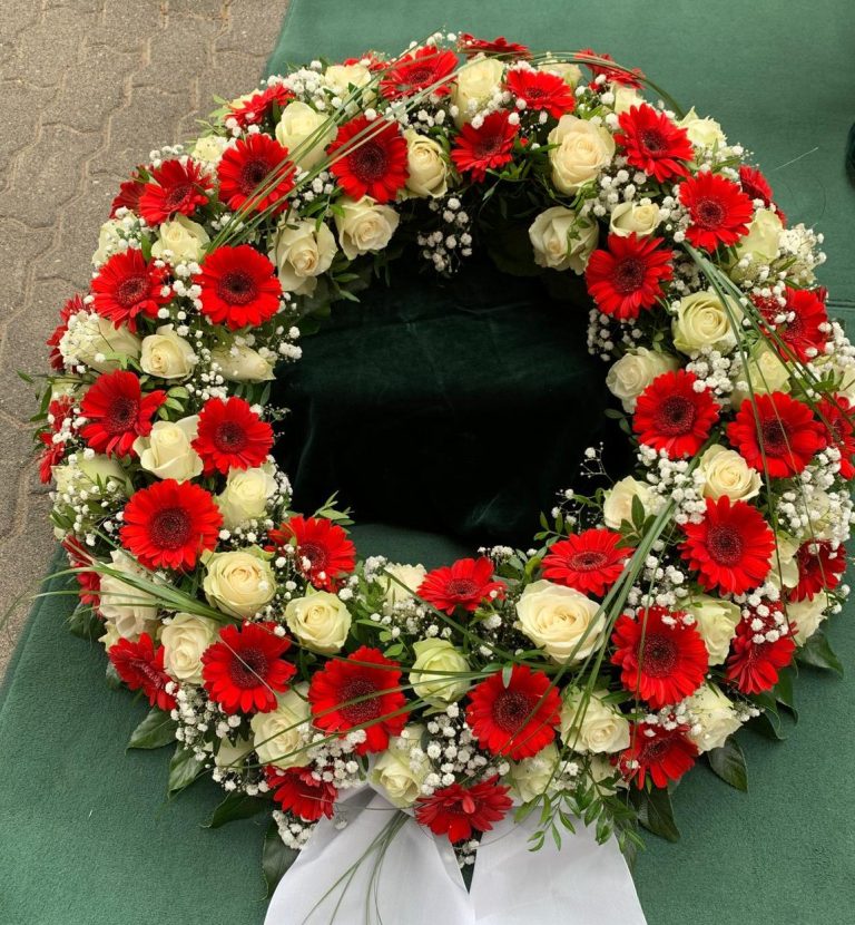 Dieser rot-weiße Kranz fällt durch die besondere Form der Rosen auf. Die Calla veredeln den Kranz und lassen ihn modern aber auch zeitlos wirken.