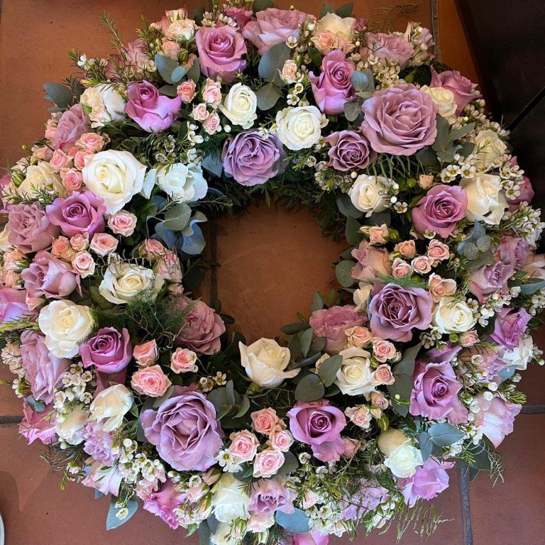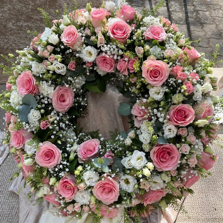Rosa Rosen und gefüllter Lisianthus dominieren in diesem zarten Kranz.