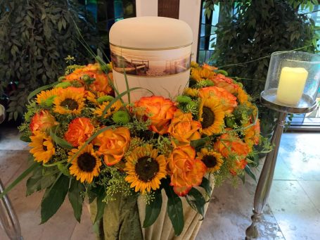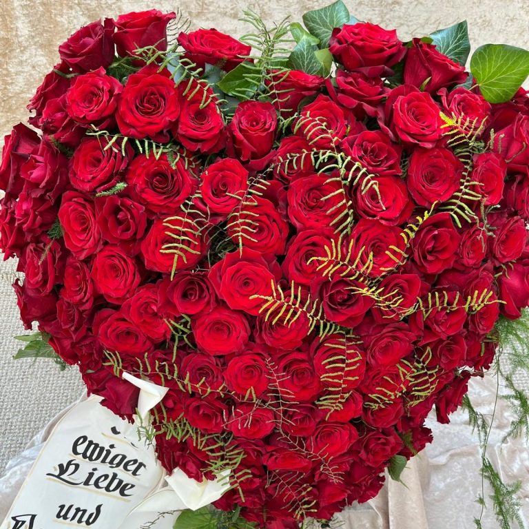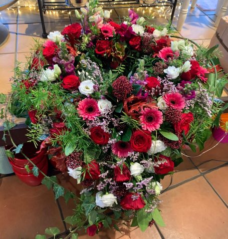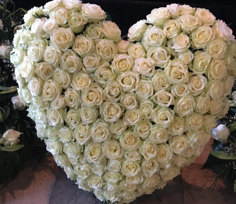 Diese komplette Ummantelung einer Urne überzeugt mit großen weißen Ranunkeln und kräftig roten Rosen, der weiße Ginster rundet dieses Meisterstück ab.