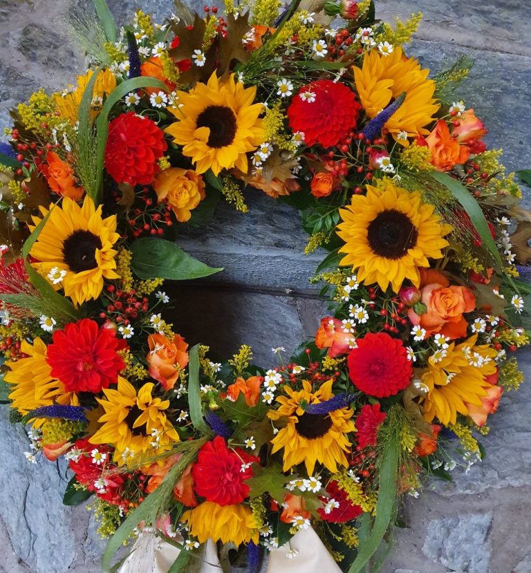 Bei diesem Stück bekommen sie pure Flower Power; herbstlich kräftige Farben mit allerlei Blumen. Hier fehlt es an nichts; Dahlien, Sonnenblumen, Rosen, ergänzt mit Kamille, die den Kranz charmant umspielen.