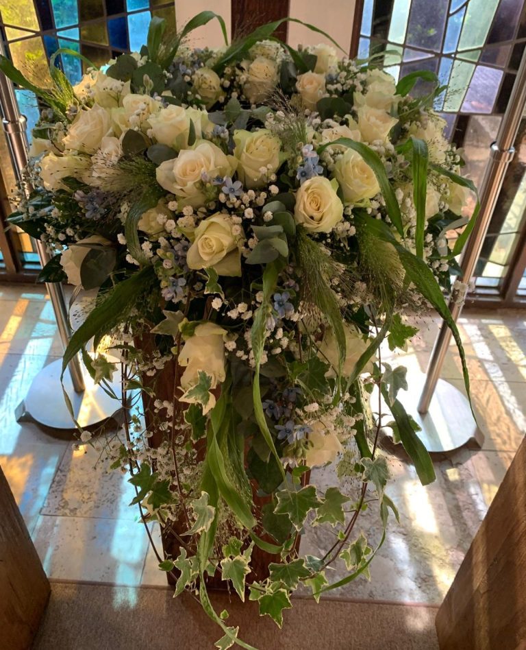 Klassische weiße Rosen, die von allerlei Grün begleitet werden. Der zusammenlaufende Efeu machen ihn einmalig.
